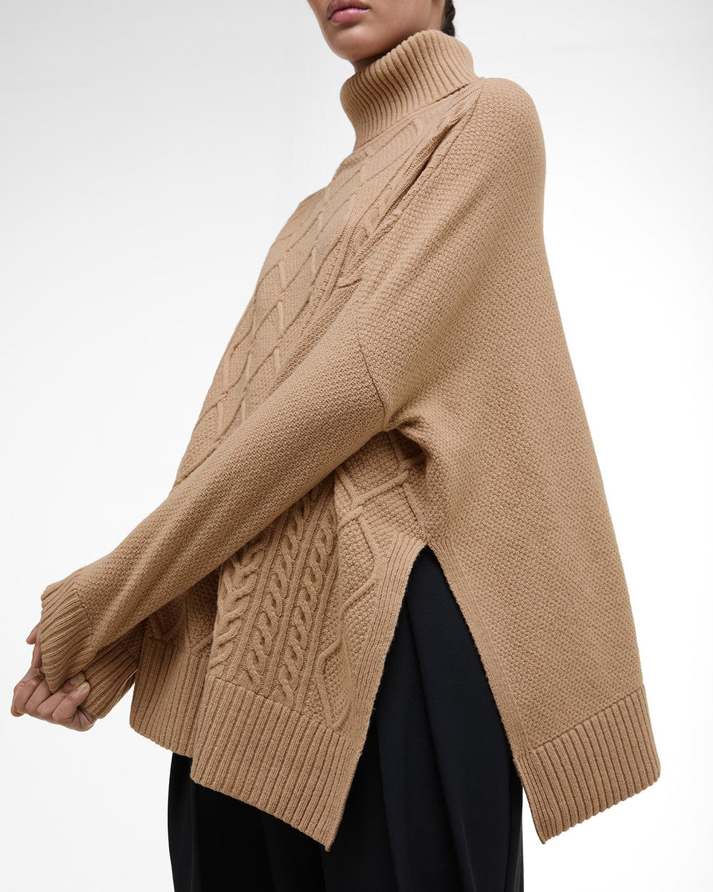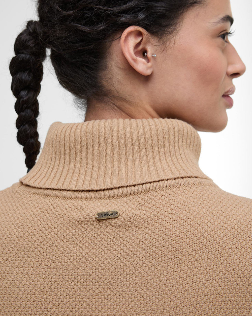 The Barbour Burne cape is imagined in a warm wool-blend fabric with a roll neck and long sleeves. It’s detailed with an argyle-inspired cable knit, making it a stylish option for updating casualwear looks.