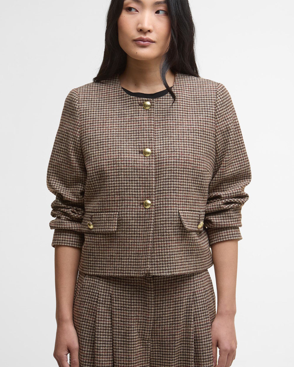 Elevate your everyday style with the timelessly elegant Barbour Corina Collarless Jacket. This tailored style has been designed to a cropped silhouette featuring a domes button fastening with a tartan lining for a signature Barbour touch. Simply style it with tailored trousers and a minimal top for an elevated look.