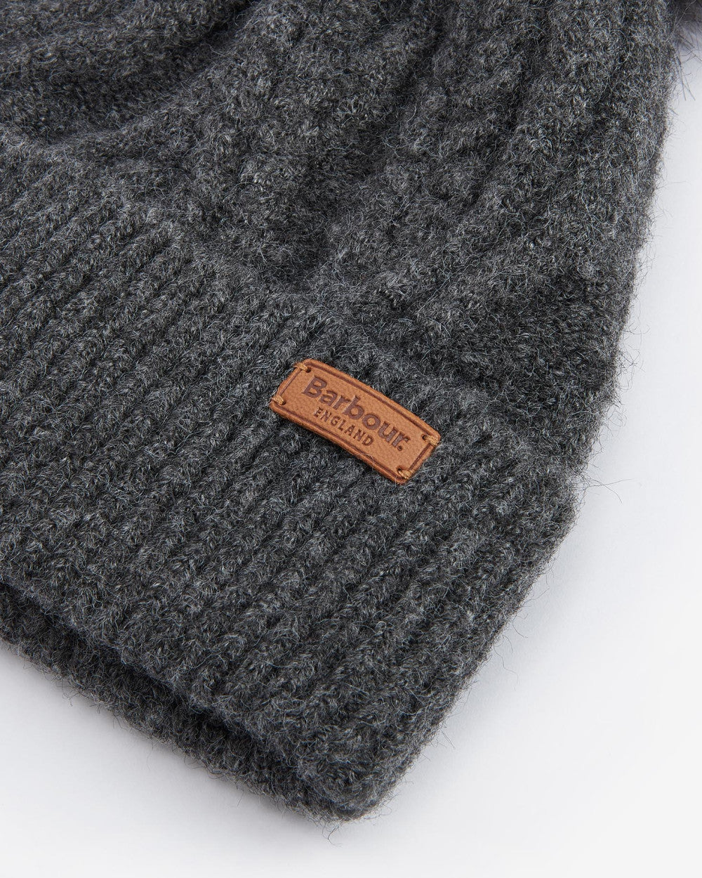 Introducing the Barbour Elsdon Beanie with a stylish cable knit and a contrasting ribbed turnup hem. Featuring a traditional faux-fur pom to the top, this must-have women's accessory is finished with a branded tab to the front for a signature look.