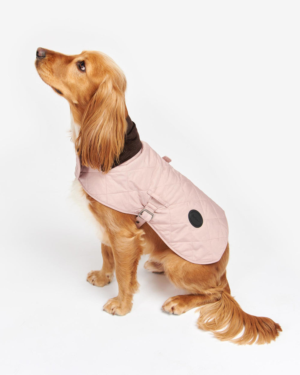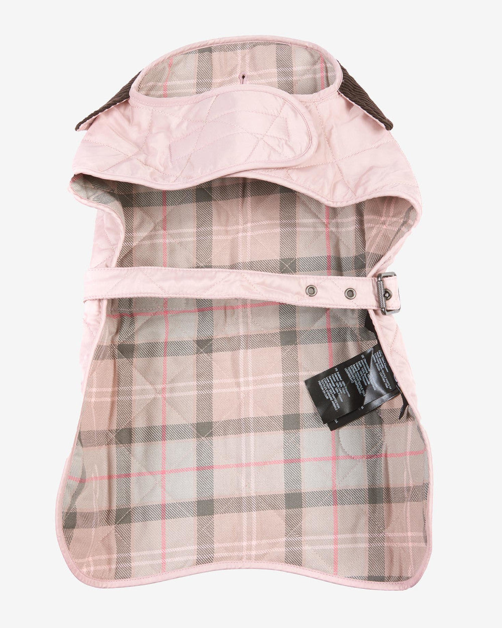 Quilted Barbour tartan dog coat with plain nylon lining. Cord collar detail and Velcro fastening underbody strap.