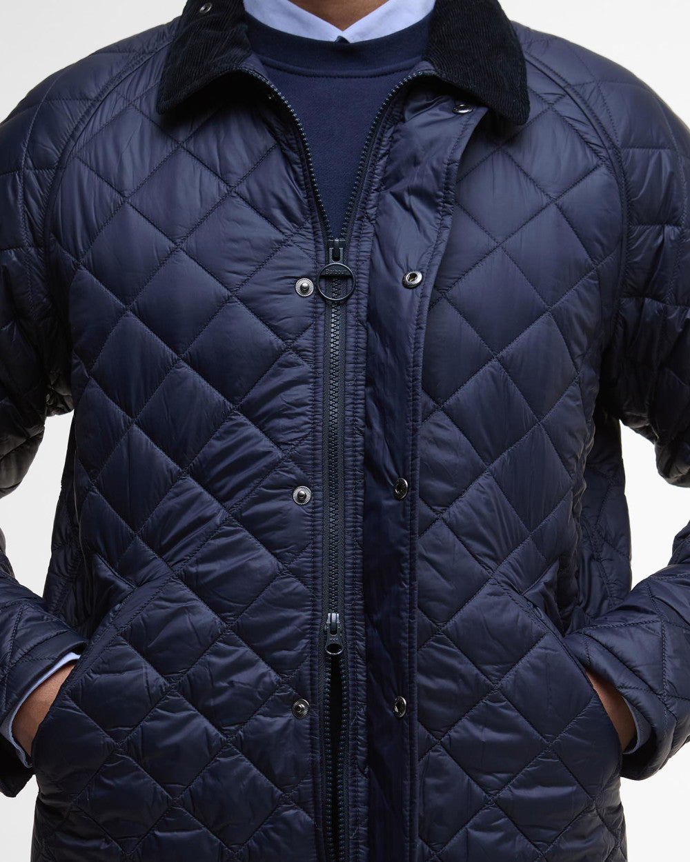 Box quilted jacket with zip and stud front placket. This style features lower storm welt pockets, needlecord collar and throat flap.