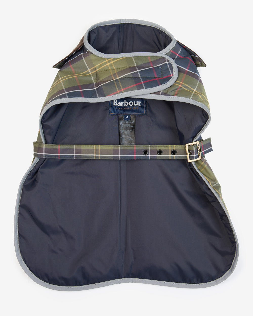 The Barbour Wetherham Tartan Dog Coat showcases a lightweight and waterproof design in an all-over tartan. Featuring a contrast collar, this coat offers an adjustable waist strap and harness hole to attach a lead.